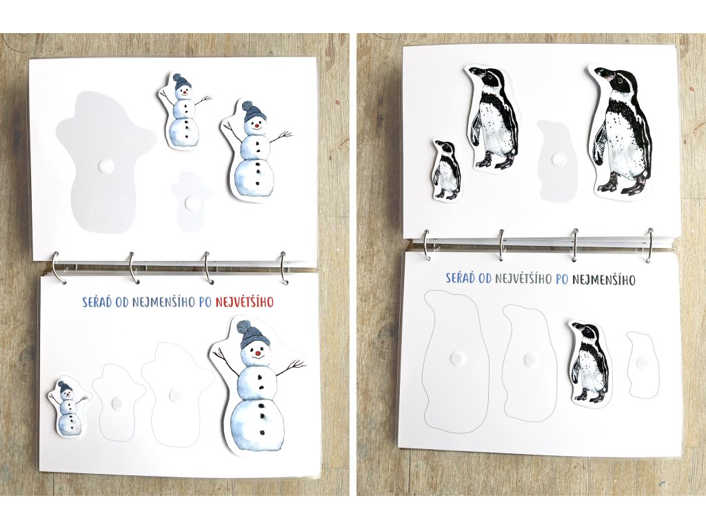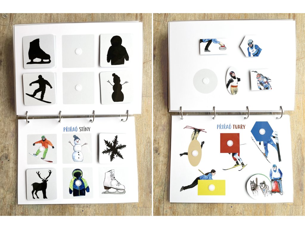 Děti se zábavnou formou naučí poznávat zimní sporty nebo zimní oblečení. Objeví vločky nebo roztřídí zvířata, která jsou v zimě aktivní nebo spí. Třídí tvary a barvy, počítají, přiřazují stíny a seřazují podle velikosti.