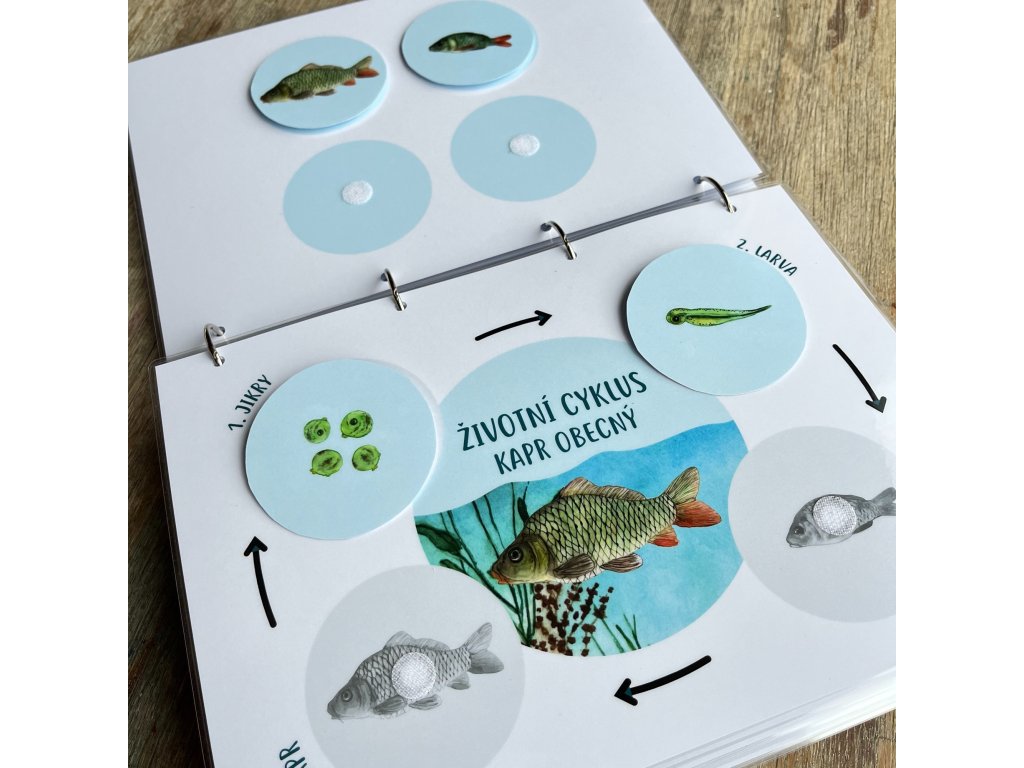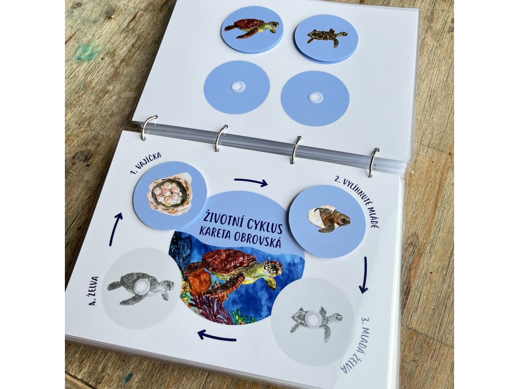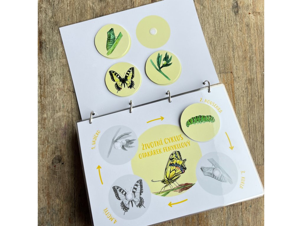 Interaktivní kniha aktivit Životní cykly pro poznávání, rozvoj jemné motoriky, slovní zásoby, spolupráce, postřehu, paměti a logického myšlení.