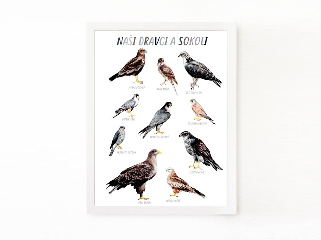 Plakát s obrázky 10 dravců a sokolů z české přírody.
