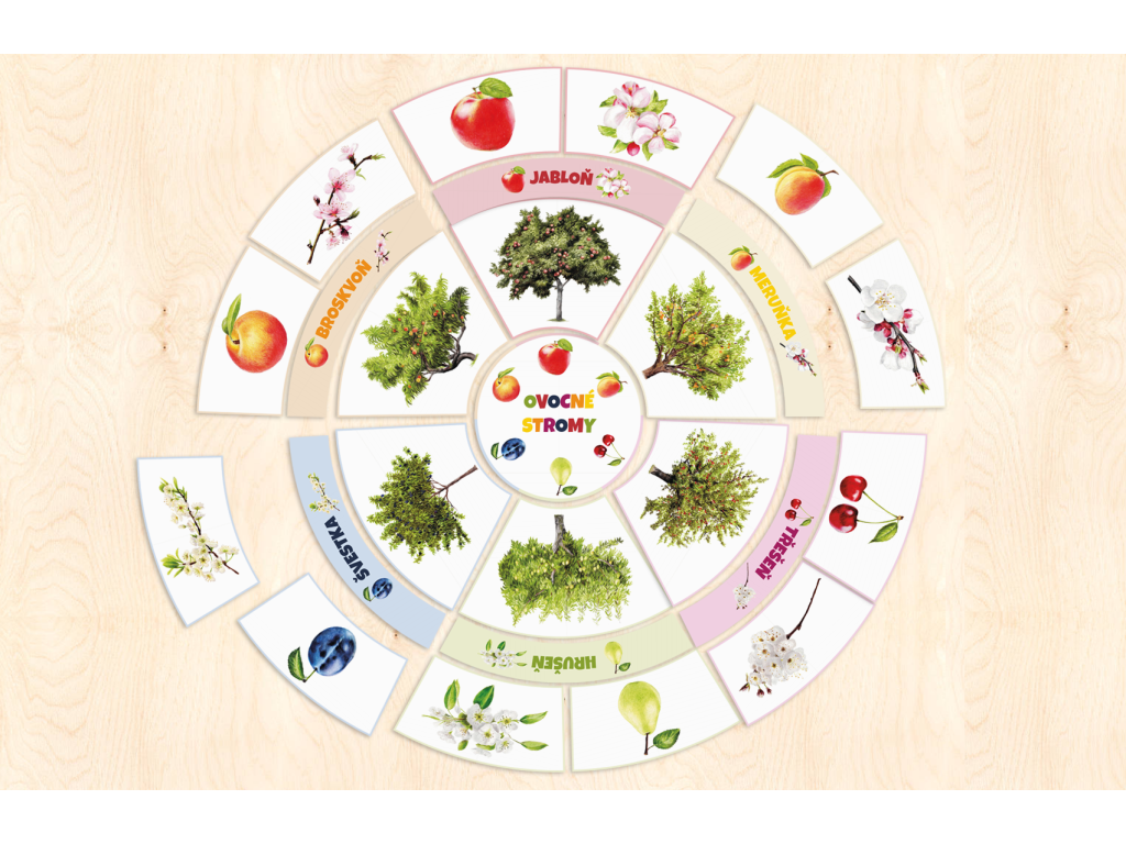 Pokládací puzzle kruh s 6 druhy ovocných stromů. Jejich plody a květy.